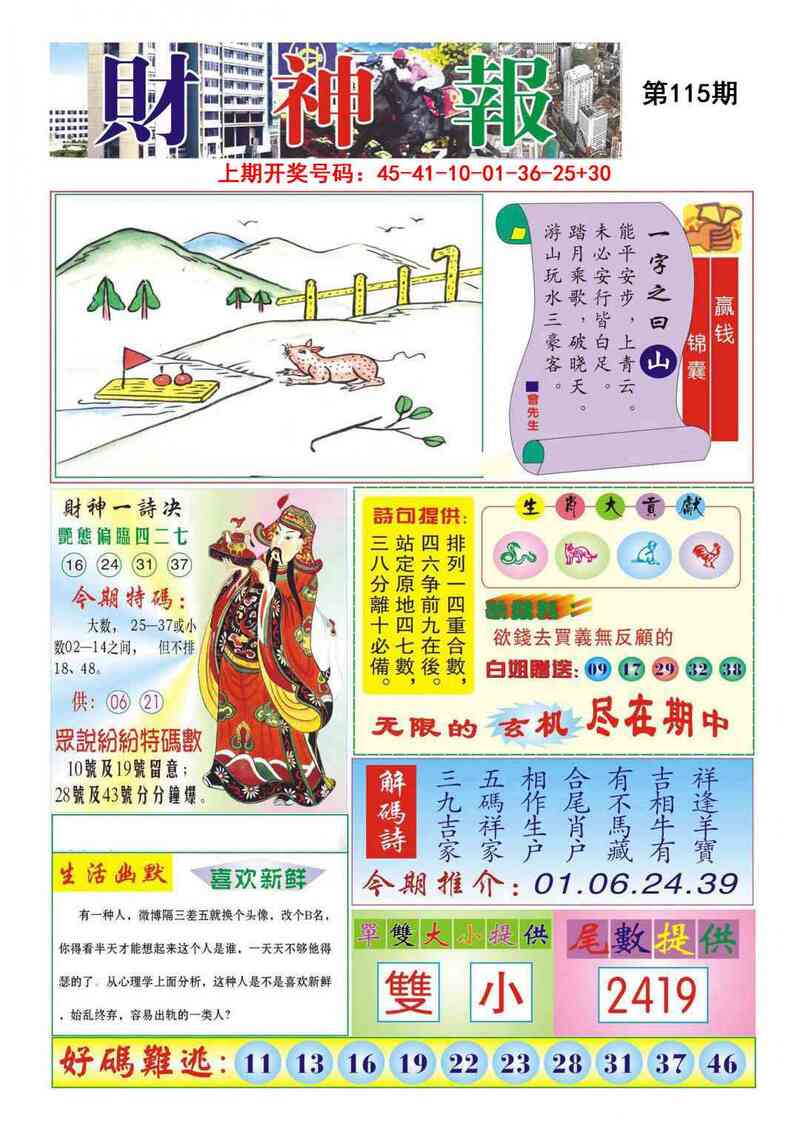 | 111期①码 | 30 | 开:马01 |